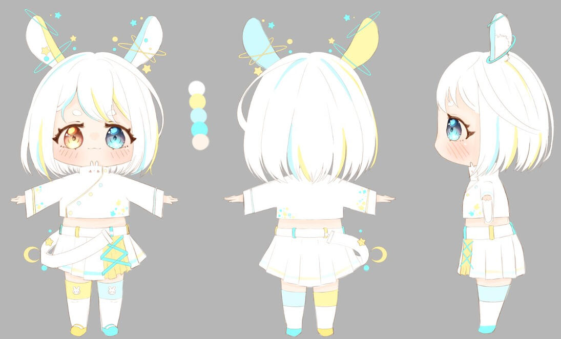 Front + Back + Chibi design (1 outfit, 1 hairstyle) - USD300++To add outfits, hairstyles, props, mascots, etc please DM for further clarificationsVtuber Model Commission